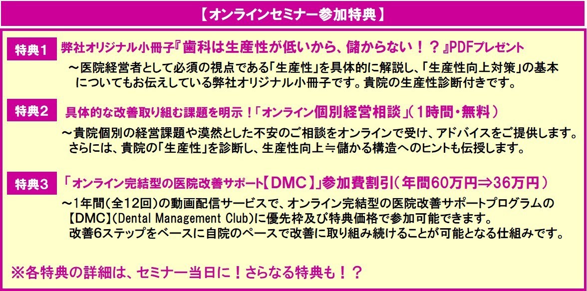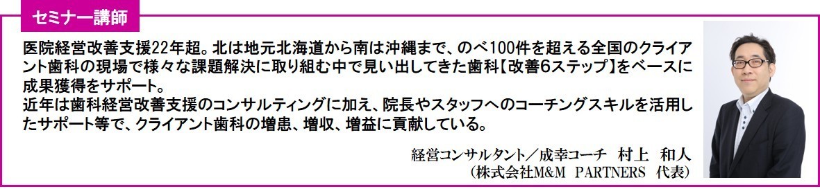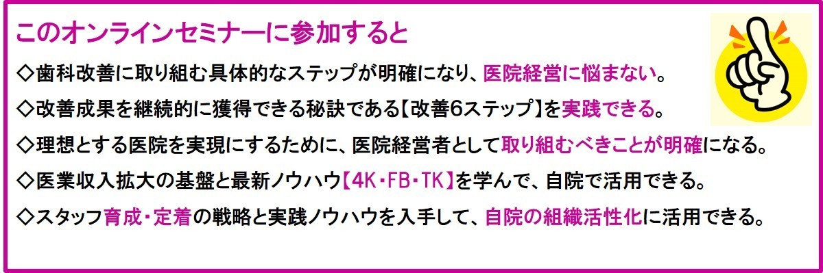 今回のオンラインセミナーでは、【改善6ステップ】を自院で活用する実践法と貴院の明るい未来を創る経営者に思考法等をお伝えします。